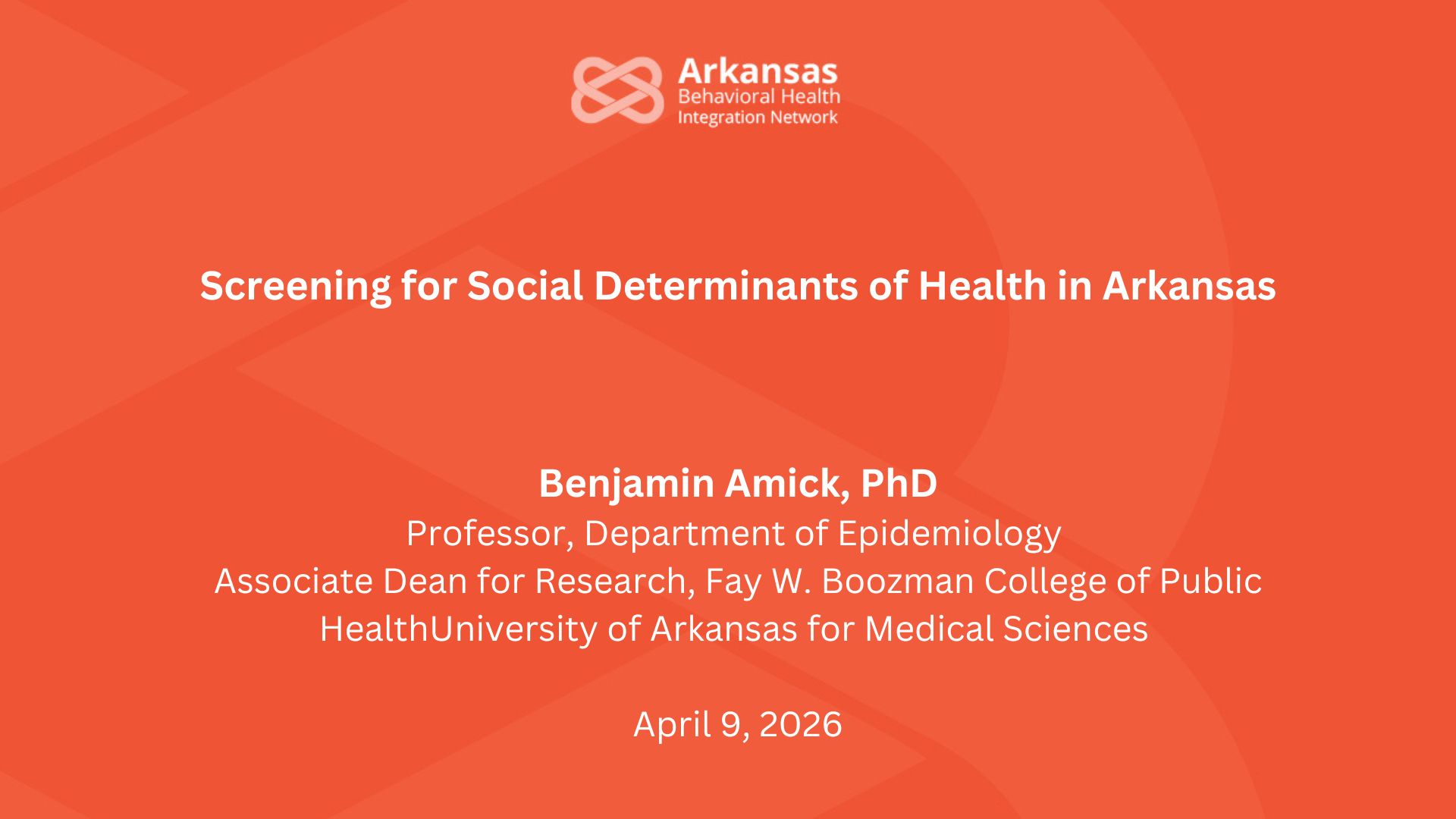 Screening for Social Determinants of Health in Arkansas 2026, 2026, Benjamin Amick PhD, Webinars Screening for Social Determinants of Health in Arkansas By ABHIN|2026-04-10T17:23:39-05:00April 10, 2026|2026, 2026, Benjamin Amick PhD, Webinars|